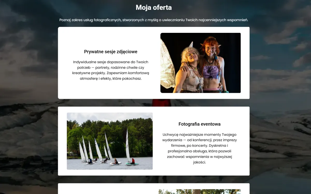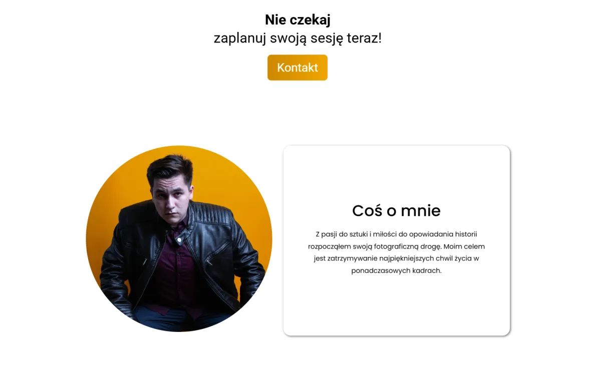 Strona skupiona jest na przyciąganiu nowych klientów oraz prezentacji wybranych realizacji fotografa w przejrzysty, estetyczny sposób. Projekt łączy minimalistyczny układ z podkreśleniem jakości i stylu pracy fotografa.